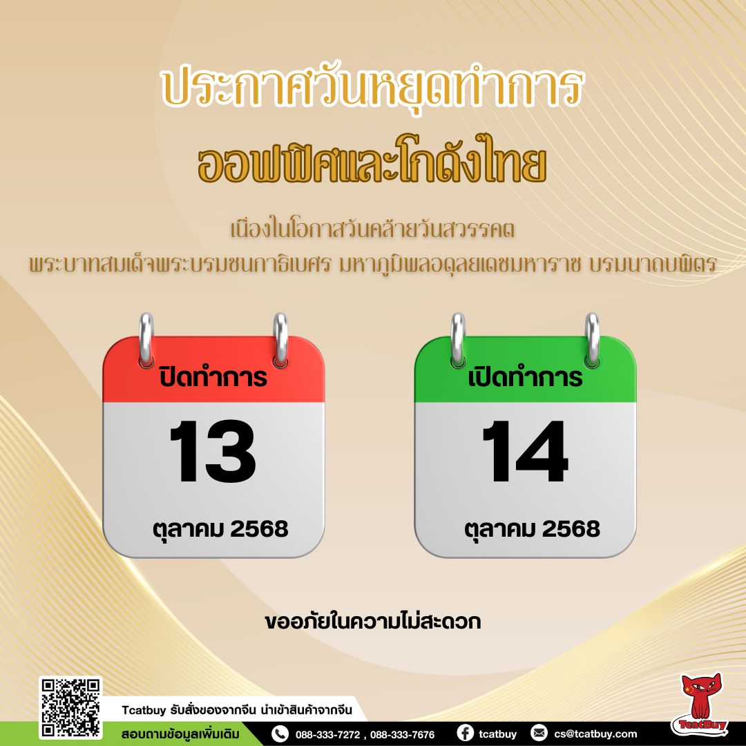 ทางออฟฟิศและโกดังไทย ปิดทำการในวันที่ 13 ตุลาคม 2568 และ จะเปิดให้ทำการในวันที่ 14 ตุลาคม 2568