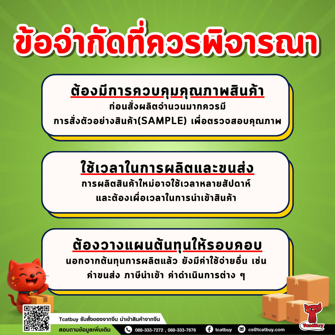 อย่างไรก็ตาม ก่อนตัดสินใจสั่งผลิตสินค้า ควรทำความเข้าใจทั้งข้อดี ข้อจำกัด และความเหมาะสมกับธุรกิจของตัวเอง
